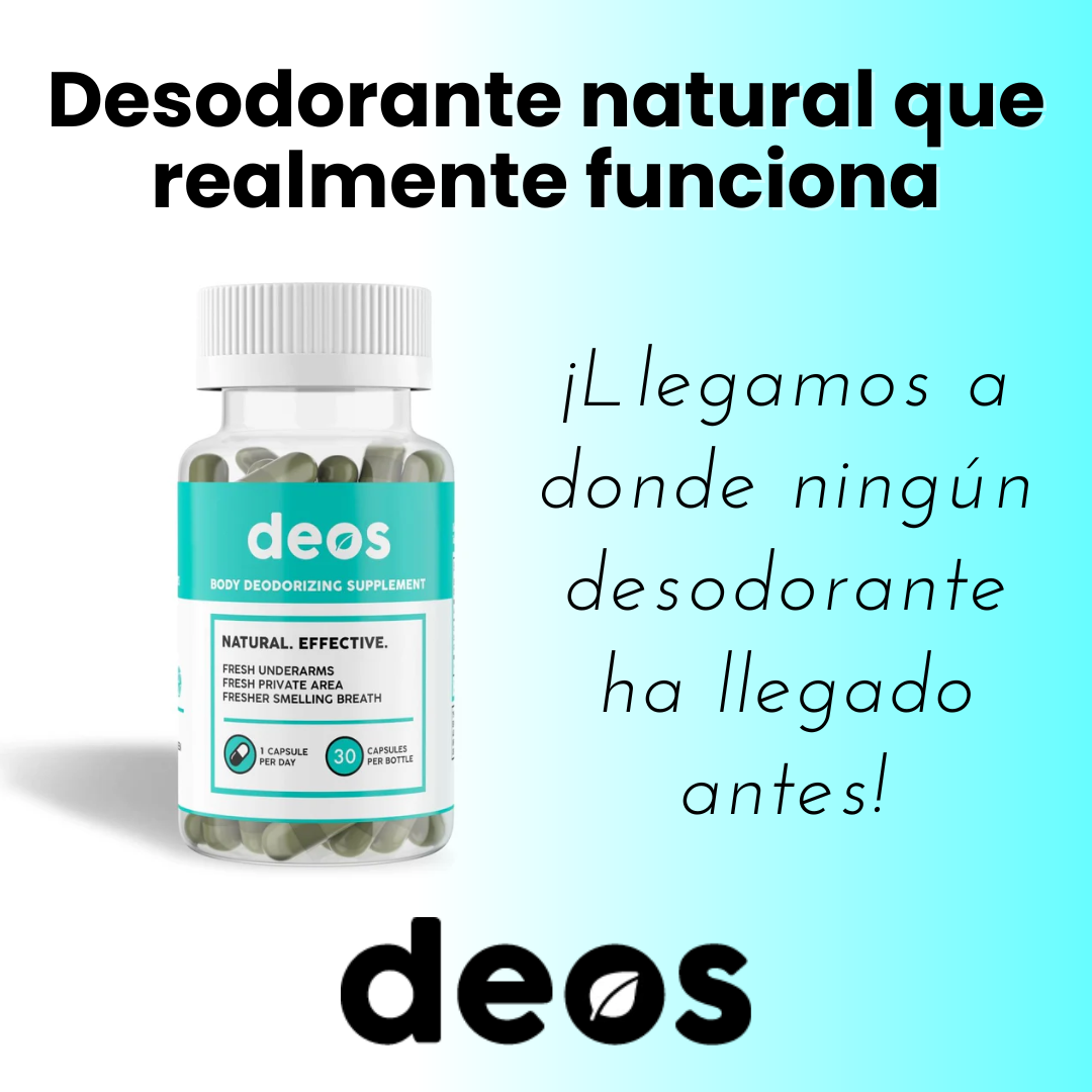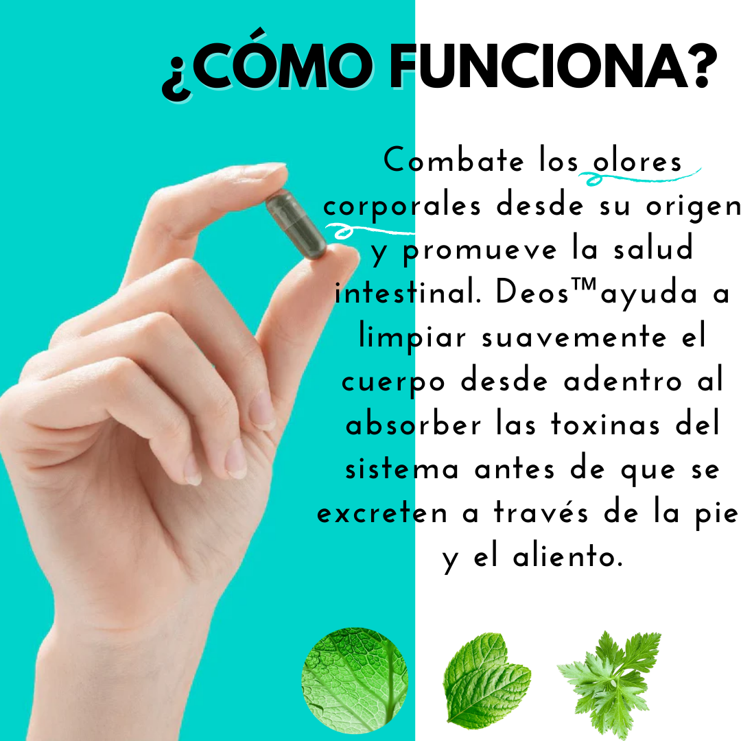 No es solo un desodorante. Con Deos™ disfrutará de una protección total contra el mal olor corporal, una mejor salud intestinal y una piel más clara, todo con una cápsula diaria.
